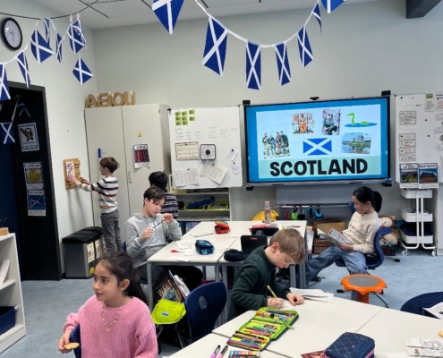 Aktuelles, Bilinguale GrundschuleEinmal um die Welt ging es für die Bilinguale Grundschule an insgesamt drei Projekttagen. Jeden Tag konnten die Kinder ein anderes Land entdecken und mehr über Musik, Spiele, Essen, Kleidung und den Schulalltag erfahren.
