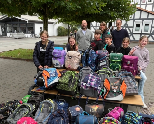 Aktuelles, Aktuelles Schule, AllgemeinIhre gespendeten Ranzen für Kinder in der Marburger Partnerstadt Sibiu präsentierten Schülerinnen und Schüler der Unterstufe ganz stolz dem Vertreter der Marburger Jugendförderung (hinten links) sowie Theresa Großer und Björn Gemmer vom…