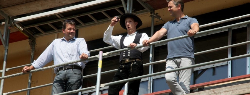 Ein weiterer Meilenstein im Baufortschritt unseres Neubaus: Unter Beisein vieler geladener Gäste sprach Zimmerer Benjamin Gudde in traditioneller Manier den Richtspruch. Das abschließend von den Höhen des Gerüsts geworfene Schnapsglas zersprang auf den Boden in Scherben und somit sollten die nächsten Schritte des Baus unter einem guten Vorzeichen stehen. Auch die Rahmenbedingungen waren glücklich: Es herrschte gute Laune bei sonnigem Wetter und musikalischer Untermalung durch Tom Herfert am Saxophon und Fynn Konnertz an der E-Gitarre. Architekt Thomas Oesterle ließ es sich im Verlauf der Feier nicht nehmen, zahlreiche Interessierte auf einem Rundgang ins neue Gebäude und durch die einzelnen Räume zu begleiten.