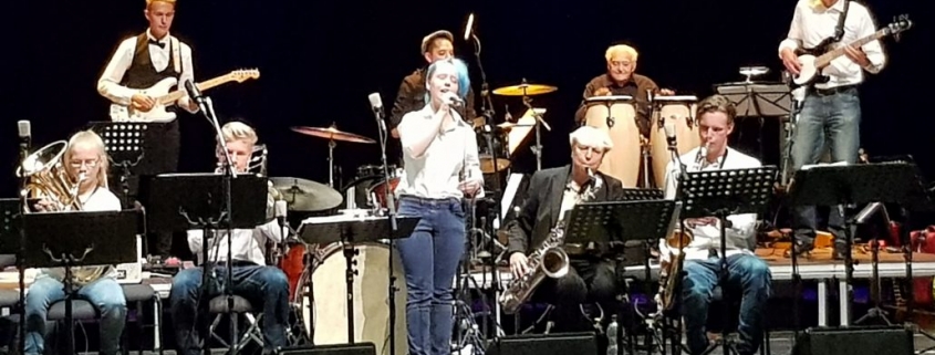 Eine ganze Woche probten die Musiker der N.N. Swinging Wodka Lemmon Gang für dieses Konzert zusammen mit unserem JazzEnsemble jeweils nach dem Unterricht im großen Musiksaal der Steinmühle. Das intensive Coaching von Lisa Pollard machte sich bezahlt und das Ergebnis konnte sich am Samstag entsprechend hören lassen: Zusammen mit der N.N. Swinging Wodka Lemmon Gang machte das JazzEnsemble den Anfang, nach der Pause zeigten Joe Wulf and the Gentlemen of Swing ihre Musikalität und ihr außergewöhnliches Können und zum Schluss gab es noch ein großes Finale mit allen Musikern des Abends. Ein Höhepunkt war das spontan initiierte letzte Stück, bei dem der 91-Jährige Schlagzeuger Arno Funk sein Können an den Bongos unter Beweis stellen konnte. So gab es zum Abschluss stehende Ovationen für alle Musiker.