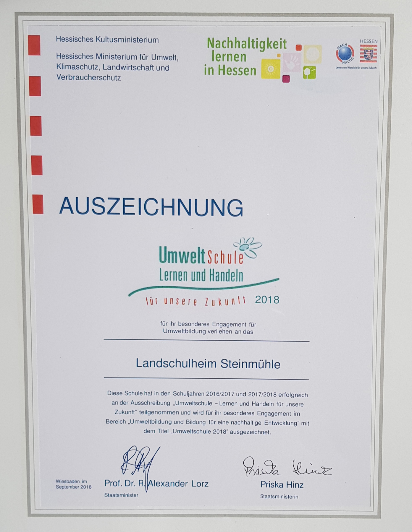 Die Steinmühle ist erneut als Umweltschule zertifiziert worden. „Umweltschule – Lernen und Handeln für unsere Zukunft“ ist eine Auszeichnung, die vom Hessischen Ministerium für Umwelt, Klimaschutz, Landwirtschaft und Verbraucher-schutz (HMUKLV) und vom Hessischen Kultusministerium für das besondere Engagement einer Schule im Bereich Umweltbildung und ökologische Bildung vergeben wird. Im Fokus stehen die Verbesserung der Qualität von Unterricht und Schulleben im Sinne der Bildung für eine nachhaltige Entwicklung. Schülerinnen und Schüler sollen Unterstützung dabei finden, die notwendigen Kompetenzen für die Gestaltung eines nachhaltigen Lebensstils zu entwickeln.