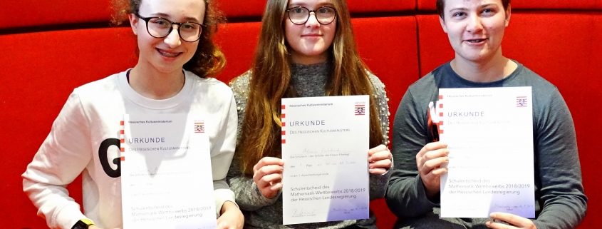 Bei der verbindlichen Vergleichsarbeit in Mathematik für die 8. Klasse, dem „Mathematikwettbewerb des Landes Hessen“,  waren in diesem Jahr Aliena Eutebach (8a), Paula Auschill (8a) und Velten Schulz (8c) die Schulsieger an der Steinmühle. Von 48 möglichen Punkten erreichte Aliena 45, Paula 44,5 und Velten 41,5 Punkte. Alle drei werden am 7. März in der Elisabethschule an der 2. Runde des Wettbewerbs teilnehmen. Wir wünschen ihnen viel Erfolg!