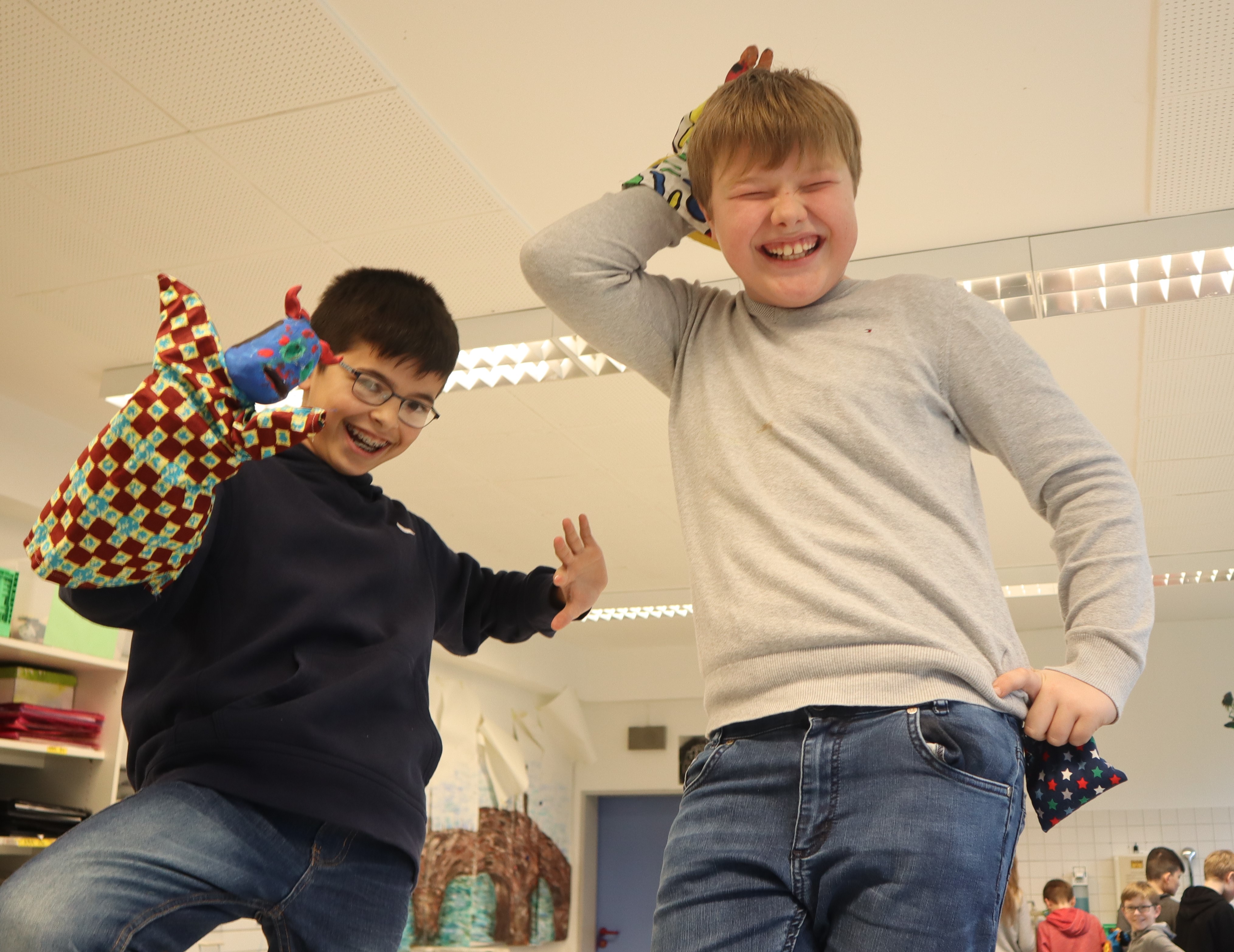 Kleider machen Leute – unter diesem Motto standen die Aktivitäten der Klasse 5a, die zusammen mit Kunstlehrerin Ines Vielhaben intensiv in die Welt der Mode und des Schneiderns eintauchte. Sechs Wochen lang lernten die Schülerinnen und Schüler Details über die Geschichte der Mode, beschäftigten sich mit der Arbeit von Modedesignern, wurden aber auch selbst aktiv. Mit der Hand nähten sie eine Handy-Hülle und wurden von Ines Vielhaben instruiert, wie man mit einer Nähmaschine umgeht. Stolz und fröhlich, wie auf den Fotos gut erkennbar, präsentierten sie später ihre Nähobjekte.