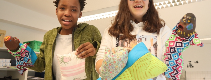 Auch ethische Aspekte aus dem Bereich der Textilverarbeitung und Bekleidungsherstellung kamen zur Sprache. Durch ihre eigenen Versuche, sich als Schneiderinnen und Schneider zu betätigen, erhielten die Mädchen und Jungen eine Ahnung davon, wie aufwändig es ist, ein Kleidungsstück herzustellen. Erörtert wurden dabei auch weltweite Produktionsbedingungen von Kleidung und die dem gegenüberstehenden Kosten. Auf diese Weise, so Ines Vielhaben, konnten die Bereiche Ethik und Kunst mit den Aktivitäten der Nähwerkstatt, die übrigens auch die Bekleidung für die Musical-Aufführungen der Klassen 5 vorbereitet, gekoppelt werden.