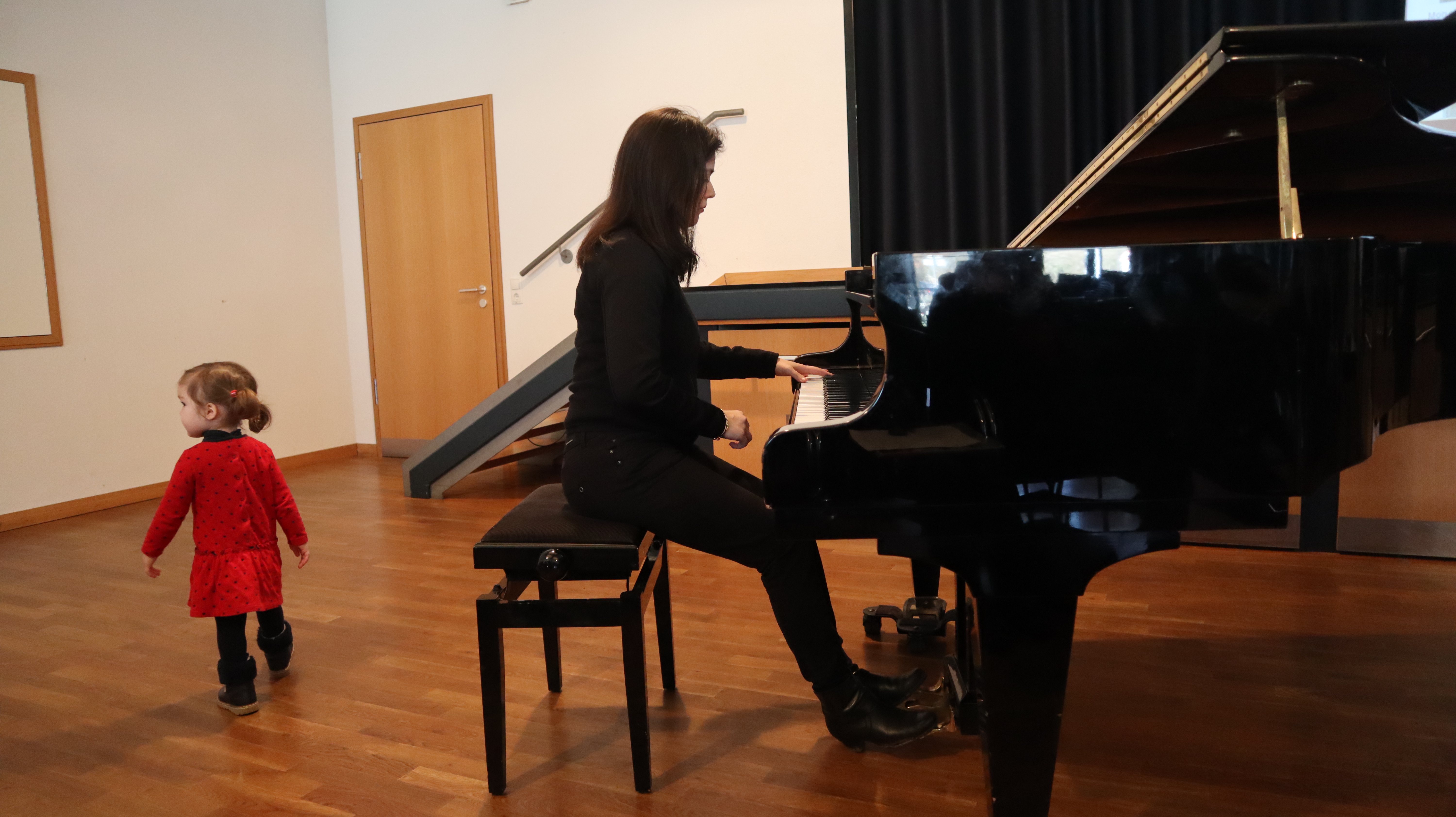 Marie Sans spielt „La cathédrale engloutie » von Claude Debussy als Opener der Präsentationen, während die Bilder Claude Monets „Kathedrale von Rouen 1893“ projiziert und die Bilder der Schülerinnen Hannah und Sarah ausgestellt werden.