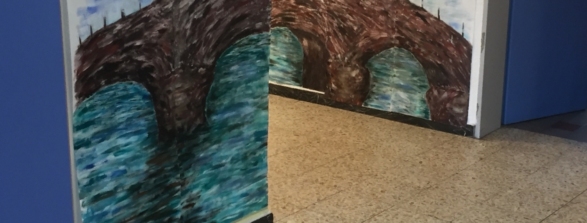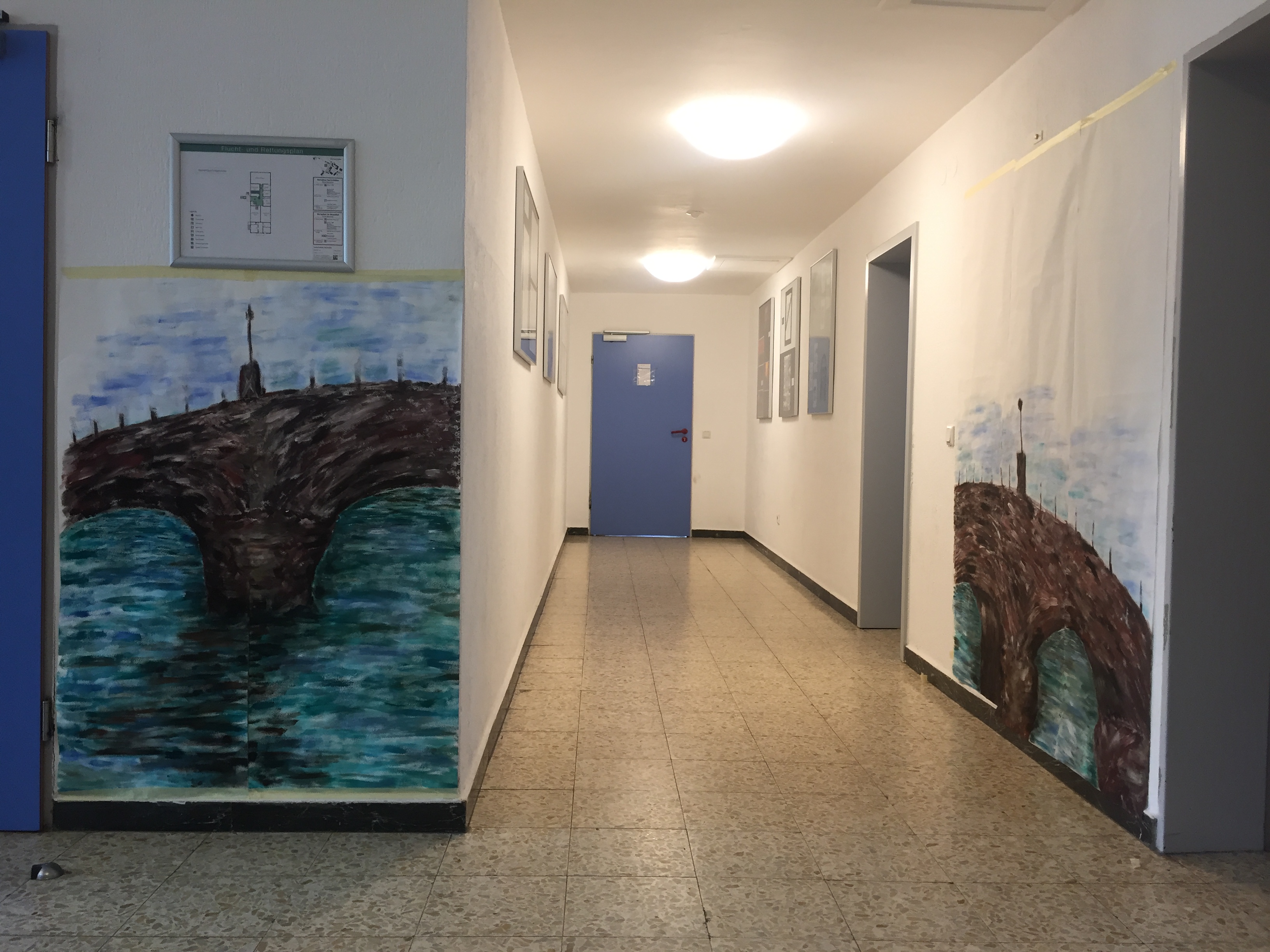 Die Weidenhäuser Brücke: Von einem bestimmten Betrachterstandpunkt im Flur des Hessenhauses verbindet sich die Brücke, doch eigentlich sind die beiden Teile getrennt von den Schülerinnen Chiara und Jana mit den typischen großzügigen Pinselstrichen auf Tapete gemalt worden.