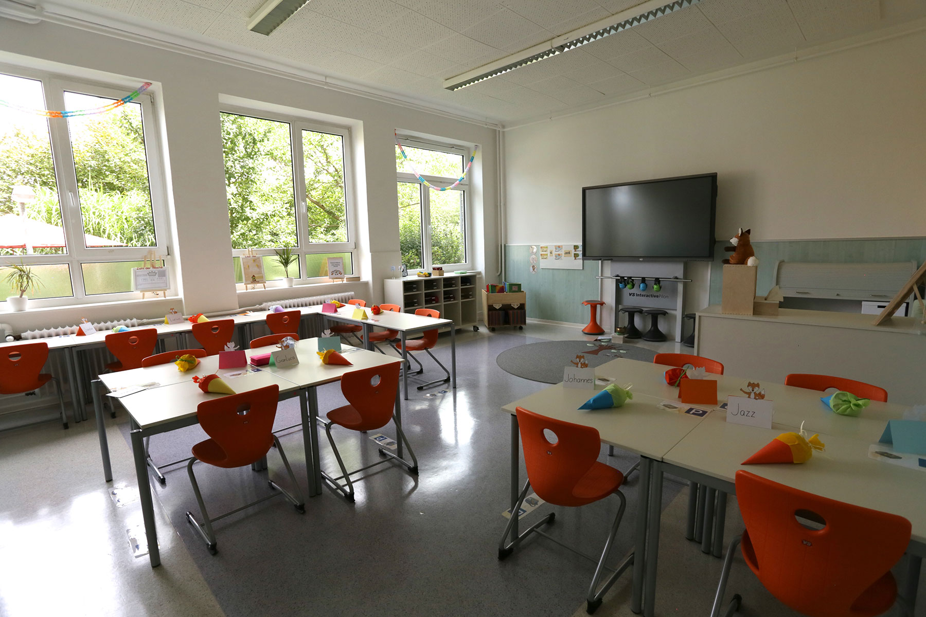 Nachdem sich das Lehrerinnenteam, bestehend aus Janine Neckenich, Hannah Achenbach, Lori Hermann, Nicole Johnson und Miriam Kaps vorgestellt und neben den Unterrichtsfächern auch die eigenen persönlichen Schwerpunkte und Zielsetzungen in kindgerechter Weise dargestellt hatte, gaben Janine Neckenich und ihre Kollegin Hannah Achenbach die Klassenaufteilung bekannt. Sie sind Klassenlehrerinnen der beiden Flex-Gruppen und gingen sodann mit ihren Schülerinnen und Schülern in Richtung Bremerhaus. Dort gab es gleich die erste Unterrichtsstunde in den beiden Klassenräumen, die über die Sommerferien in liebevoller Weise renoviert, hergerichtet und ausgestattet wurden. „Wir haben alles sorgfältig vorbereitet,“ verriet Janine Neckenich – und davon konnten sich kurze Zeit später die Angehörigen der jüngsten Steinmühlenschülerinnen und -schüler staunend überzeugen, nachdem sie die Zwischenzeit mit Kaffee, Kuchen und Gesprächen verbracht hatten. Auch wurden sie eingeladen, dem Förderverein der Steinmühle beizutreten. Als Ansprechpartnerin stand die Vorsitzende Jasmine Weidenbach für Fragen zur Verfügung.