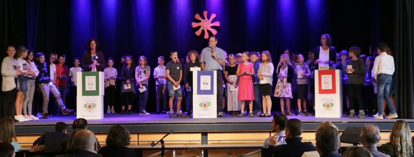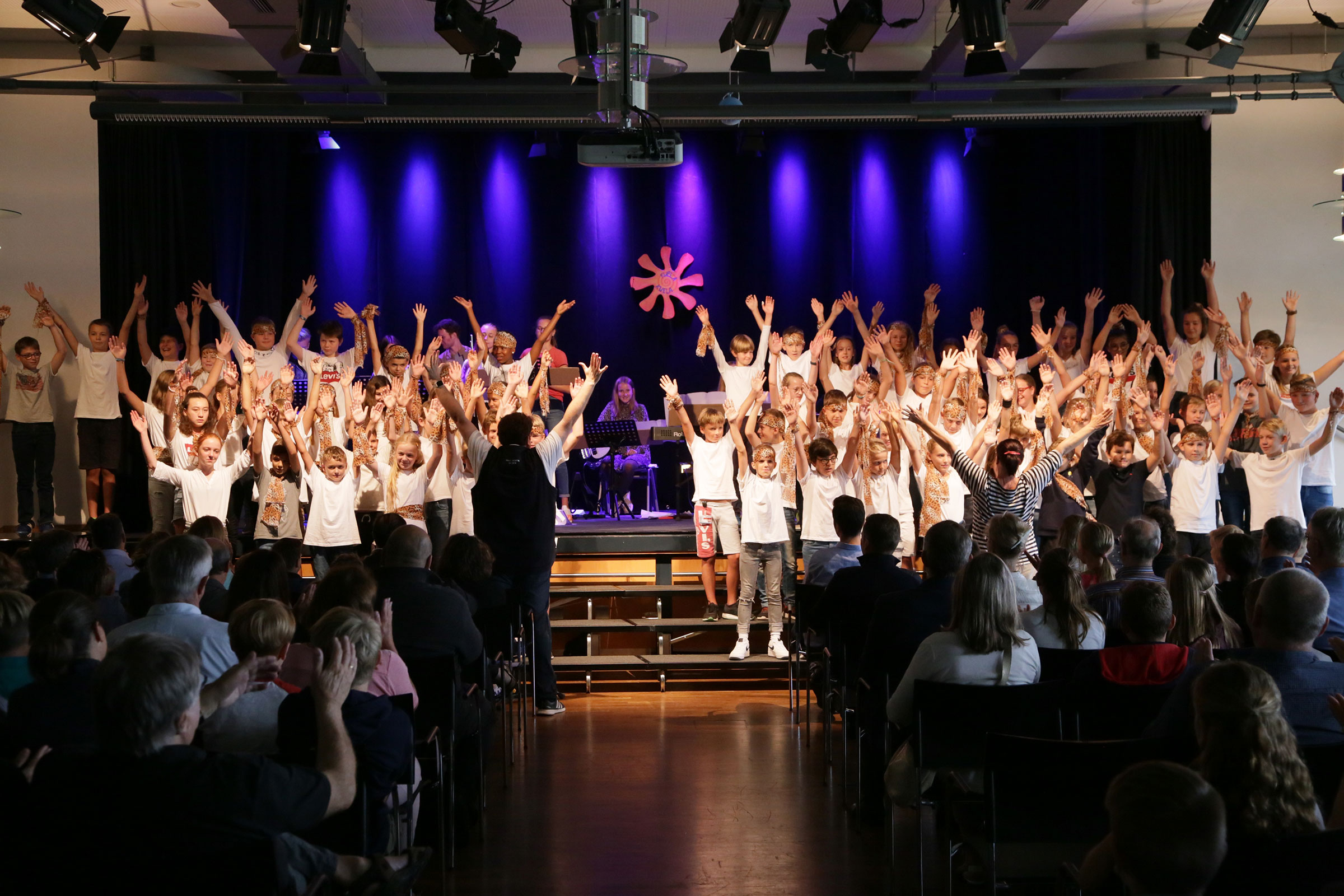 Alle Plätze waren belegt im Forum – und wer nicht sitzen konnte, der stand an den Wänden. Viele der neuen Fünftklässlerinnen und Fünftklässler brachten an ihrem ersten Schultag nicht nur Eltern, sondern auch Großeltern und Geschwister mit. Das Publikum sah zur Einstimmung auf diesen besonderen Tag eine besondere Aufführung: Die Klassen 6 – gefühlt erst kürzlich selber an der Stelle der Neuankömmlinge – führten einen Ausschnitt aus ihrem Vorjahresmusical auf: Temperamentvoll, rhytmisch und stimmgewaltig, begleitet von der Musicalband. Die Lehrkräfte Ulrike Wilmsmeyer, Daniel Sans und Frank Wemme waren hierbei Garanten für die Professionalität der Beiträge.