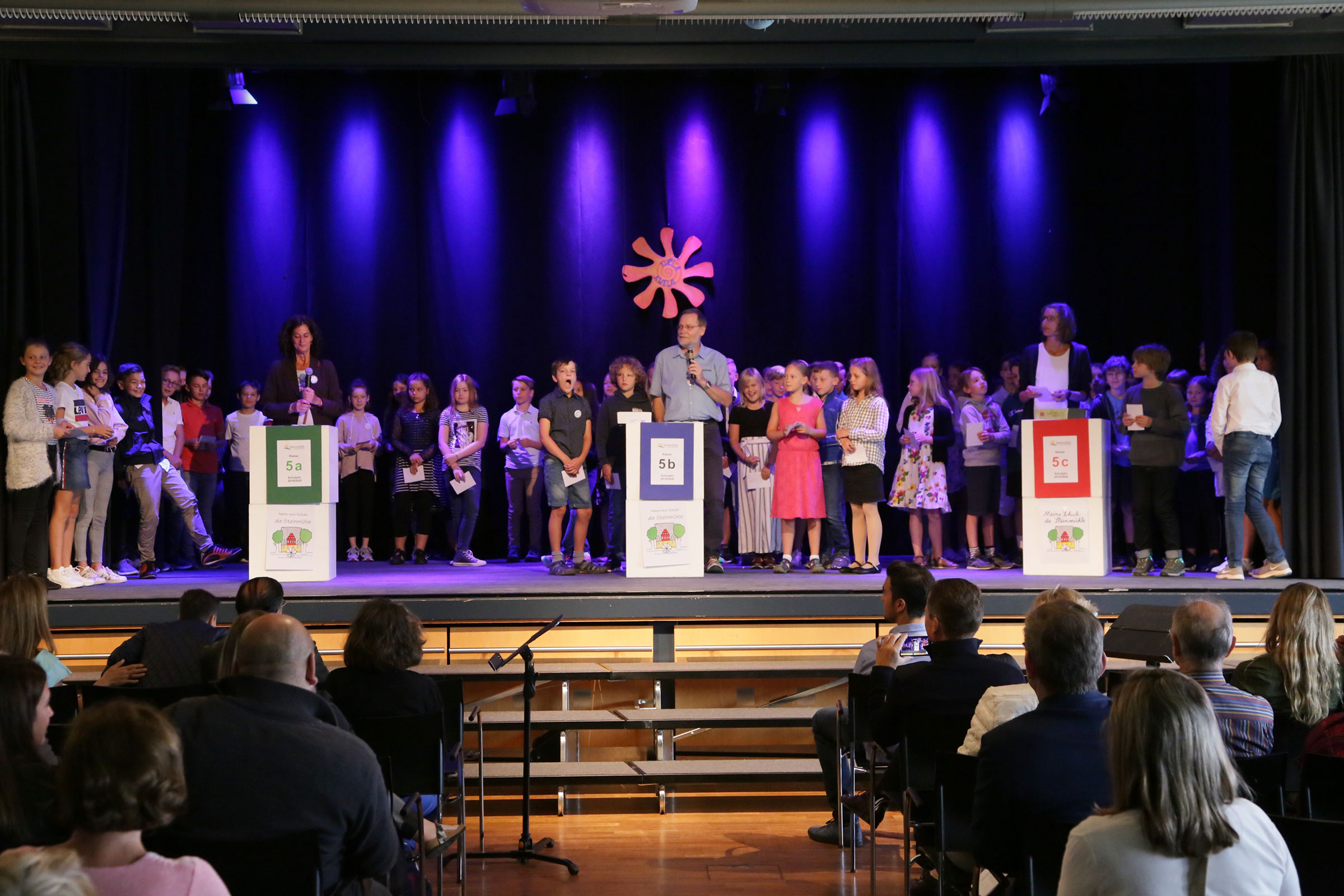 Alle Plätze waren belegt im Forum – und wer nicht sitzen konnte, der stand an den Wänden. Viele der neuen Fünftklässlerinnen und Fünftklässler brachten an ihrem ersten Schultag nicht nur Eltern, sondern auch Großeltern und Geschwister mit. Das Publikum sah zur Einstimmung auf diesen besonderen Tag eine besondere Aufführung: Die Klassen 6 – gefühlt erst kürzlich selber an der Stelle der Neuankömmlinge – führten einen Ausschnitt aus ihrem Vorjahresmusical auf: Temperamentvoll, rhytmisch und stimmgewaltig, begleitet von der Musicalband. Die Lehrkräfte Ulrike Wilmsmeyer, Daniel Sans und Frank Wemme waren hierbei Garanten für die Professionalität der Beiträge.