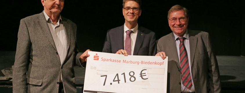 Vor Jahrzehnten war die „Stiftung Steinmühle e.V.“ gegründet worden mit dem Zweck, Schüler/innen im Internat zu unterstützen, denen es schwer fiel, Schul- und vor allem Internatsgebühren aufzubringen. In den vergangenen Jahren waren die Aktivitäten von „Stiftung Steinmühle e.V.“ nicht mehr sichtbar. Nach dem Tode des Vorsitzenden Thilo von Thümen, der von 1956 bis 1965 Schüler der Steinmühle war, hatte man den Beschluss zur Auflösung des Vereins getroffen. Es waren insbesondere die ehemaligen Steinmühlenschüler und Mitglieder Axel Becker (Foto links) und Udo Graul (rechts), die die Vereinsauflösung vorantrieben und dafür sorgten, dass das Guthaben des Vereins aktuell dem Schulverein Steinmühle Marburg e.V. übertragen werden konnte. Im Rahmen der Feier zum 70jährigen Steinmühlenbestehen am 20. September übergaben die beiden Mitglieder an Schulleiter Björn Gemmer (Mitte) den Scheck über den noch zu Buche stehenden Betrag von 7.418 Euro. Die Mittel werden, wie es das Ziel von „Stiftung Steinmühle e.V.“ war, für Stipendien und Schulgeldermäßigungen verwendet werden.