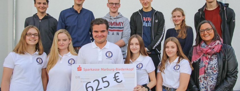 Insgesamt beliefen sich die Einnahmen auf 625 Euro, die Nadine Weigel dankbar in Empfang nahm. Das Foto zeigt Vertreter/innen beider Gruppen, die von Schullleiter Björn Gemmer betreut wurden. Die „Interacter“ sind an den weißen Polo-Shirts erkennbar.