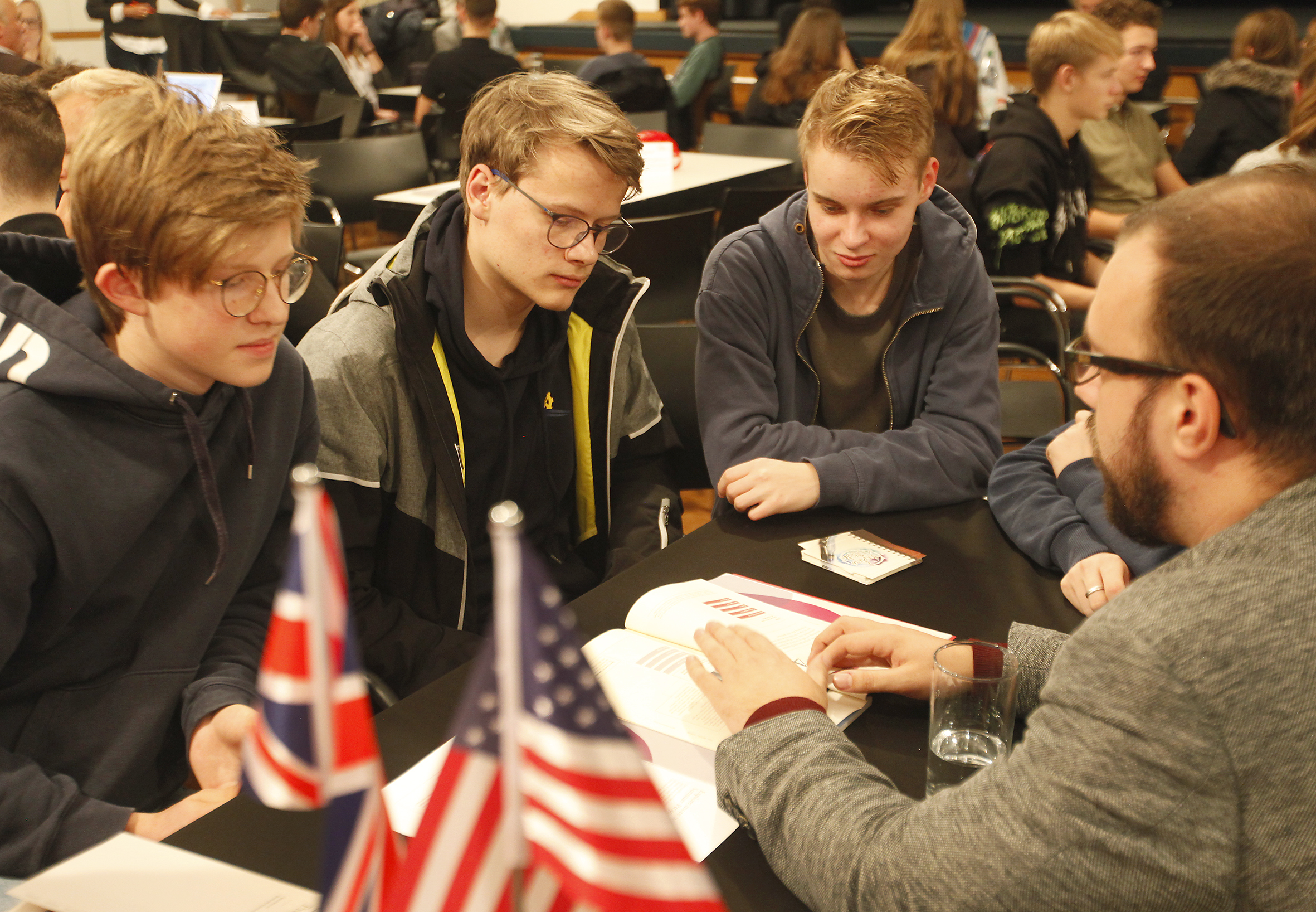 Nicht ohne Grund heißt das Motto der hessenweit organisierten Veranstaltung „Schüler fragen – Profis antworten“. Aus möglichst vielfältigen Bereichen saßen im Forum der Steinmühle Repräsentant*innen verschiedener Berufe an Tischen bereit, um Schüler*innen des Jahrgangs 12 bei ihrer Berufswahl zu helfen. So manches Vorurteil über Arbeitsbedingungen wurde ausgeräumt oder aber bestätigt, es wurden Verdienstmöglichkeiten ausgelotet und Zugangsmöglichkeiten gecheckt. Zur Sprache kam auch die Zufriedenheit bei Ausübung bestimmter Berufe nach einem längeren Zeitraum, der Umgang mit Routine und der mögliche Spaßfaktor. „Mussten Sie auch manchmal über Dinge schreiben, die Ihnen zuwider waren?“ wurde zum Beispiel die Journalistin gefragt.