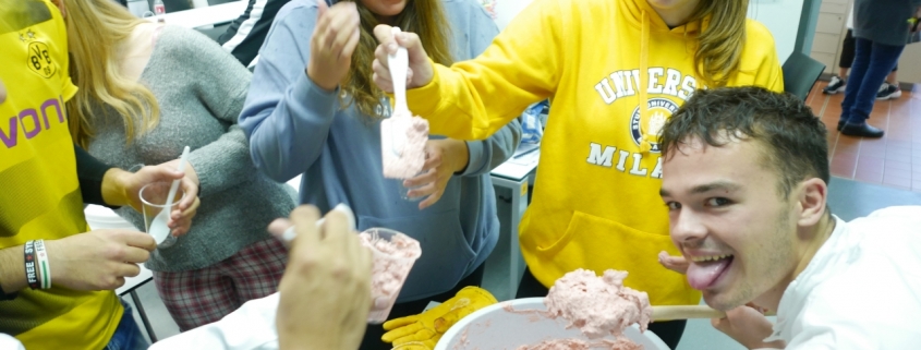 Darauf folgte am Nachmittag der zweite Teil des Versuches, die Vernetzung des Oligo- bzw. Polydimethylsiloxans mit Borsäure; die Ergebnisse waren „flummiartige“, bunte Massen. Daraufhin ging es für den Kurs in eine Jugendherberge ganz in der Nähe. Den Abend ließen die Schüler*innen gemeinsam mit ihrer Lehrerin Dr. Jutta Töhl- Borsdorf in einer gemütlichen Runde mit Abendessen in einer angrenzenden Kneipe ausklingen.