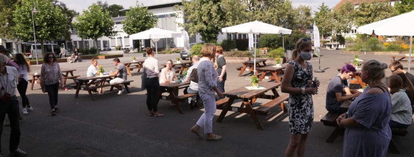 Wie gut, dass die Außenanlagen auf dem Gelände der Steinmühle so großzügig sind. Und wie schön, dass das Wetter am Anreisetag der Internatsschüler*innen so toll mitspielte. Auflagen, Abstände und Hygienemaßnahmen konnten daher den Willkommensnachmittag am Sonntag vor Schulbeginn nicht trüben. Statt wie gewohnt im Speisesaal nahmen die neuen Internatsschüler*innen mit ihren Familien an blumengeschmückten Tischgruppen unter freiem Himmel Platz – gut beschirmt vor zu warmen Sonnenstrahlen und versorgt durch das vom Küchenteam aufgebaute Kuchenbuffet, das durch Kaltgetränke und Obst ergänzt wurde. Im Hintergrund spielte leise Musik.