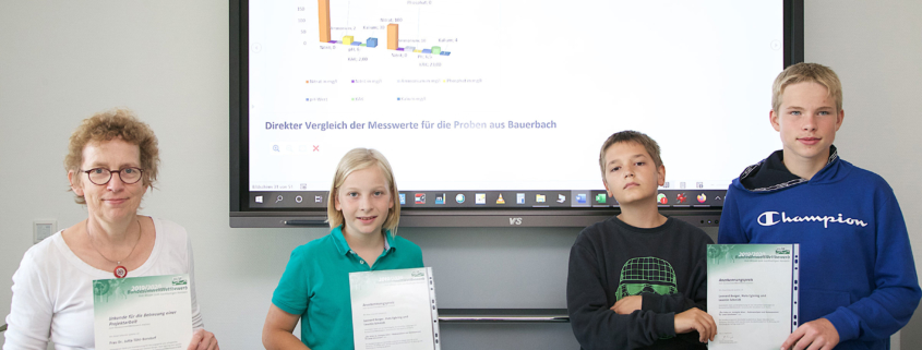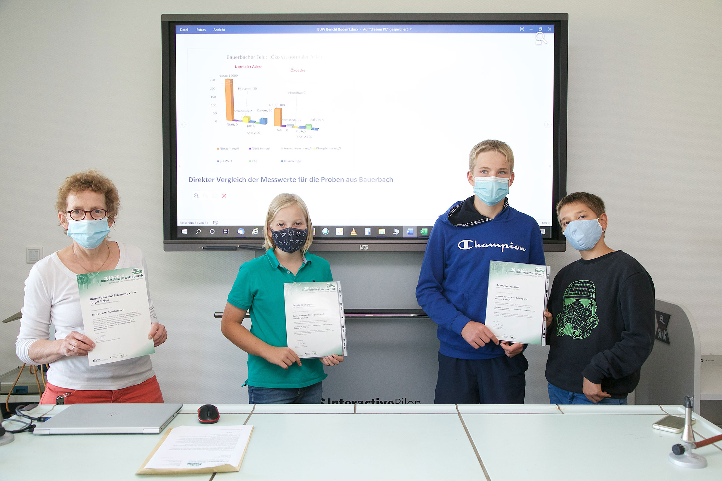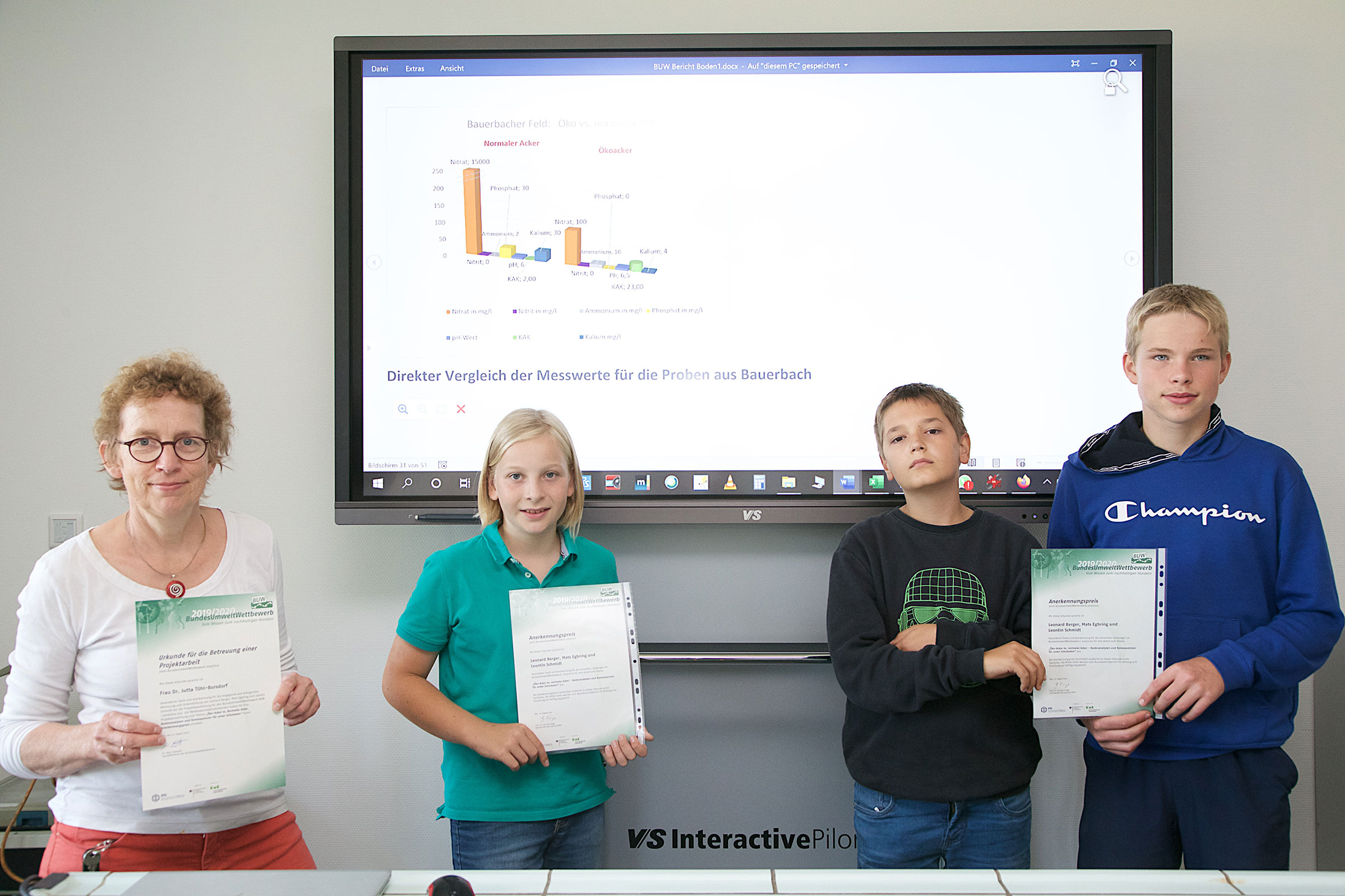 Leontin Schmidt, Mats Egbring und Leonard Berger haben bewiesen, was oft nur als Behauptung in den Raum gestellt wird: Öko-Äcker sind gegenüber normalen Äckern weniger belastet und daher eine bessere Basis für den Anbau gesunder Lebensmittel. Für ihre Arbeit erhielten die Schüler und ihre Lehrerin Dr. Jutta Töhl-Borsdorf jetzt einen Anerkennungspreis und Urkunden vom „BundesUmweltWettbewerb“ (BUW), einer Inititiative des Bundesministeriums für Forschung und Bildung.