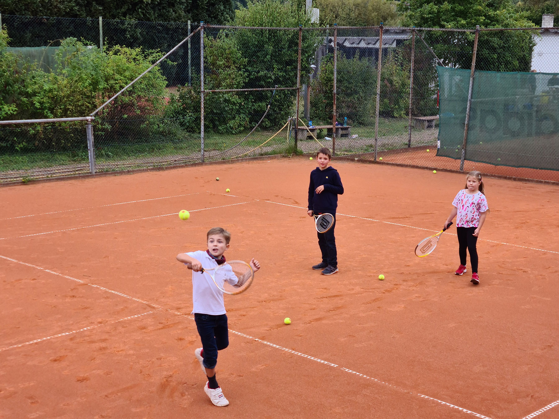 Die Abfrage erbrachte eine derart große Resonanz, dass seit Anfang September mittwochs von 12:30 Uhr bis 13 Uhr 16 Grundschüler*innen und im Anschluss von 13 bis 14 Uhr 19 Fünft- und Sechstklässler*innen trainieren. Drei Trainer stehen den Kindern zur Verfügung: Patrick Voyé wird vom Tenniskreis gestellt, die ehemaligen Steinmühlenschüler Nina und Tom Horn unterstützen.