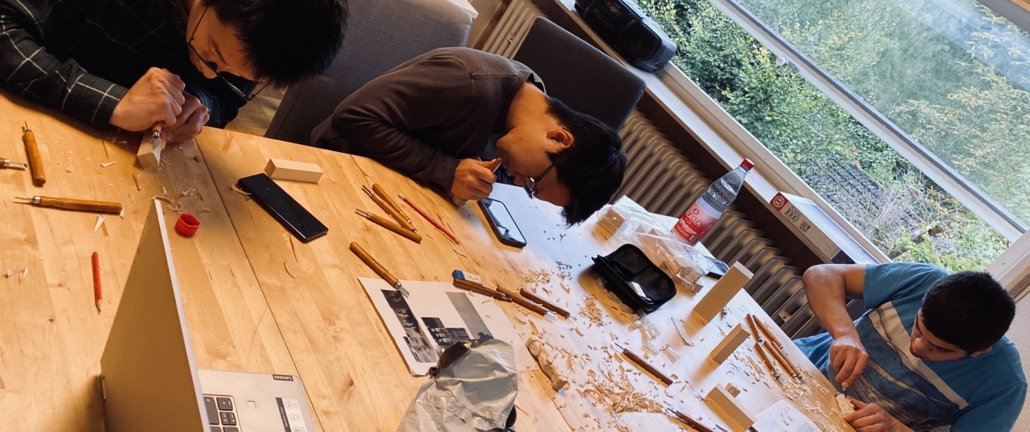 Einige Programmpunkte forderten die kreative Seite der Gruppe. Das Batiken von Turnbeuteln brachte das eine oder andere künstlerische Talent zutage. Das Betreuerteam des Waldhauses besorgte auch Schnitzwerkzeug und Schnitzholz und leitete anfangs an, eigene Ideen aus Holz zu verwirklichen. Inzwischen sind daraus eigenständige Projekte geworden. Internatsschüler Shawn stellte sich der Herausforderung, eine Terminator-Büste zu schnitzen. Wir sind gespannt…
