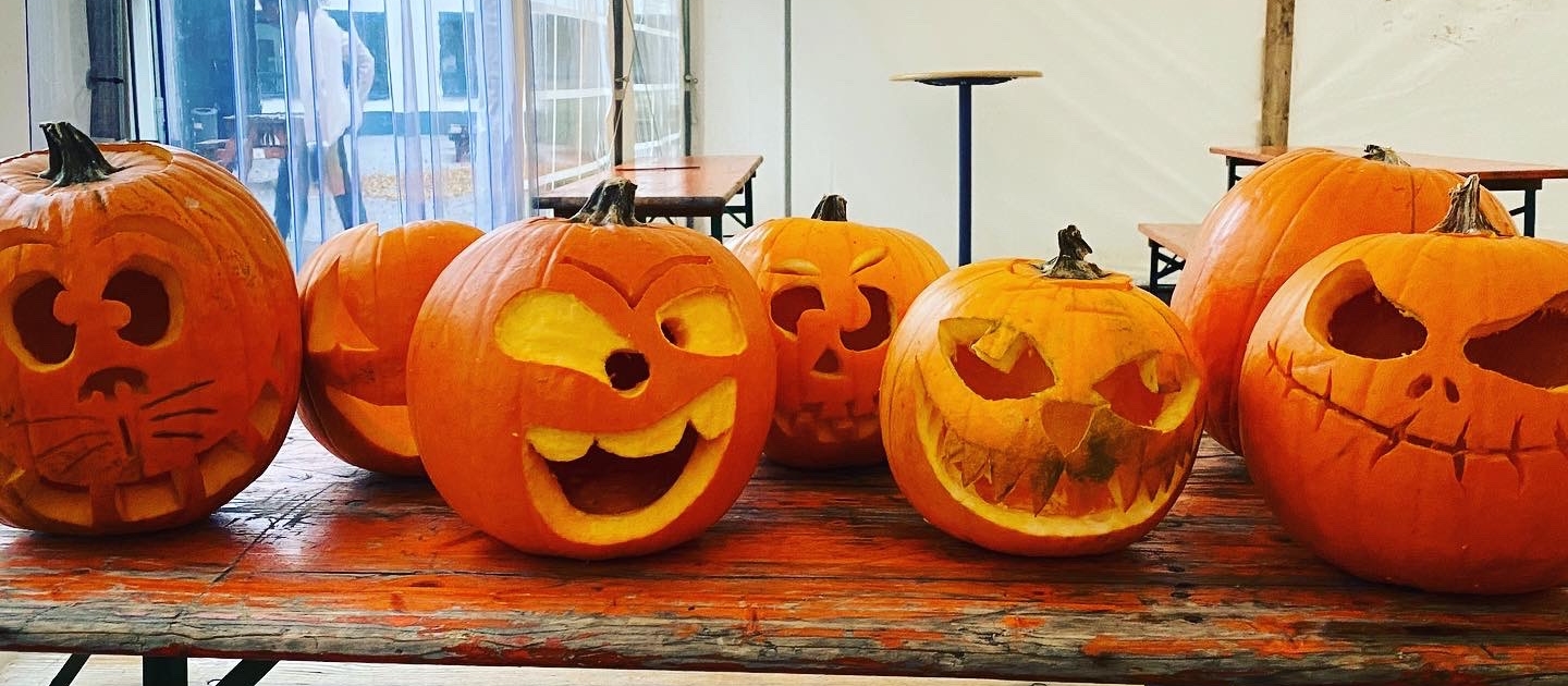 Der Klassiker Kürbisschnitzen durfte dabei natürlich nicht fehlen. Im Zelt wurden die großen Kürbisse mit professionellem Werkzeug ausgeschabt und zurechtgeschnitzt, bis am Ende sieben leuchtende Gruselköpfe den Eingang des Speisesaals verzierten. Von der Grinsekatze aus Alice im Wunderland über das Gesicht von Nightmare before Christmas bis hin zu den klassisch grimmigen Mienen wurde alles zurechtgeschnitzt. Mit Lack eingesprüht halten diese handgefertigten Kürbisse noch bis zum 31. Oktober.