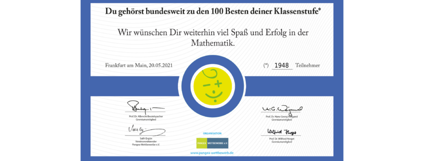 Der Pangea-Mathematikwettbewerb ist ein seit 2007 jährlich stattfindender und deutschlandweiter Mathematikwettbewerb für Schüler*innen der Klassenstufen 3 bis 10. Die Steinmühle beteiligt sich regelmäßig daran. Dieses Jahr kamen 21 der insgesamt rund 11.000 teilnehmenden Schülerinnen und Schüler von der Steinmühle. Davon haben es acht Teilnehmerinnen und Teilnehmer geschafft, zu den Jahrgangsbesten zu gehören, teilte Mathematiklehrer Bernd Schweitzer mit.