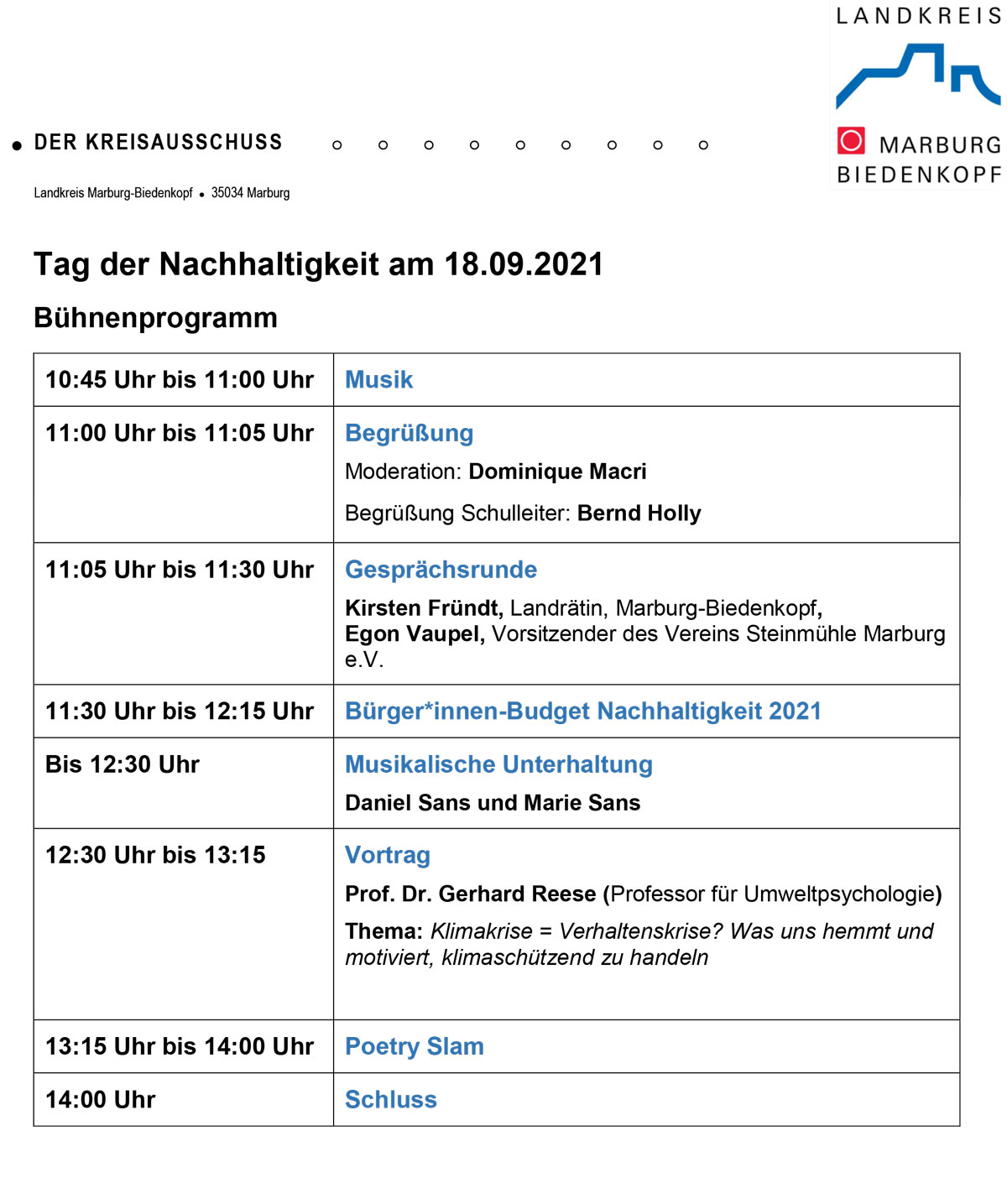 Die Begrüßung übernimmt Schulleiter Bernd Holly. Anschließend treffen sich auf der Bühne Landrätin Kirsten Fründt und der Vorsitzende des Schulvereins Steinmühle Marburg e.V., Egon Vaupel. Danach geht es um das Bürger*innen-Budget Nachhaltigkeit 2021, mit dem gemeinwohlorientierte, nachhaltige Projekte und Ideen aus der Zivilgesellschaft gefördert werden. Sodann sorgt Chorleiter, Tenor und Dirigent Daniel Sans, gleichzeitig Steinmühlen-Lehrer, zusammen mit Ehefrau Marie Sans für musikalische Unterhaltung.