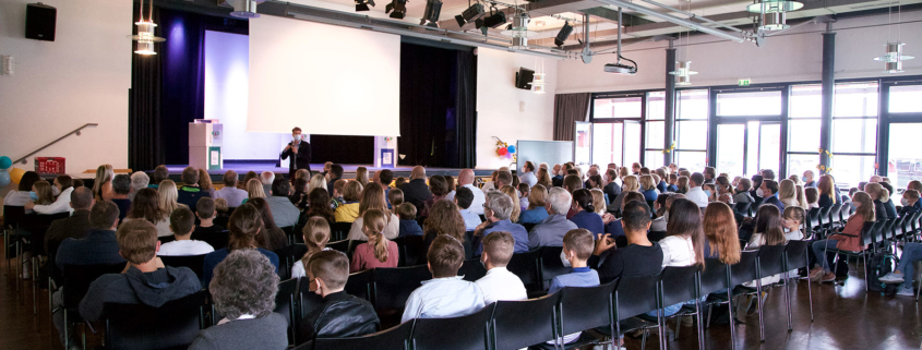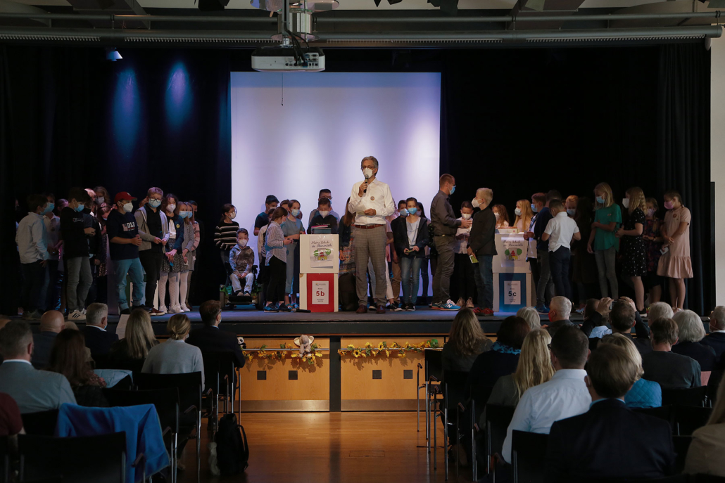 Kam der Begrüßungschor in der Aufnahme vom Juni in Bild und Ton auch nur ‚aus‘ der StoneApp, so wussten Alexandra, Antonia, Johanna und Lotta aus Klasse 6b die neuen Mitschüler*innen und ihre Eltern an der Steinmühle umso lebendiger willkommen zu heißen. Dem schlossen sich die Schulleiter nur zu gerne an! Der erste Schultag für die jungen Fünftklässler*innen war ein freundliches Willkommenheißen und Zusammenfinden in den drei Klassen 5a, 5b und 5c mit Frauke Fiedler, Frank Wemme und Dr. Bernd Schweitzer als neue Klassenlehrkräfte und ein neugieriges Einziehen in das neue eigene Schulhaus. Eltern fanden bei einer Tasse Kaffee zueinander und der Förderverein entließ die neuen Steinmühlenschüler*innen schließlich mit einem kleinen Geschenk.