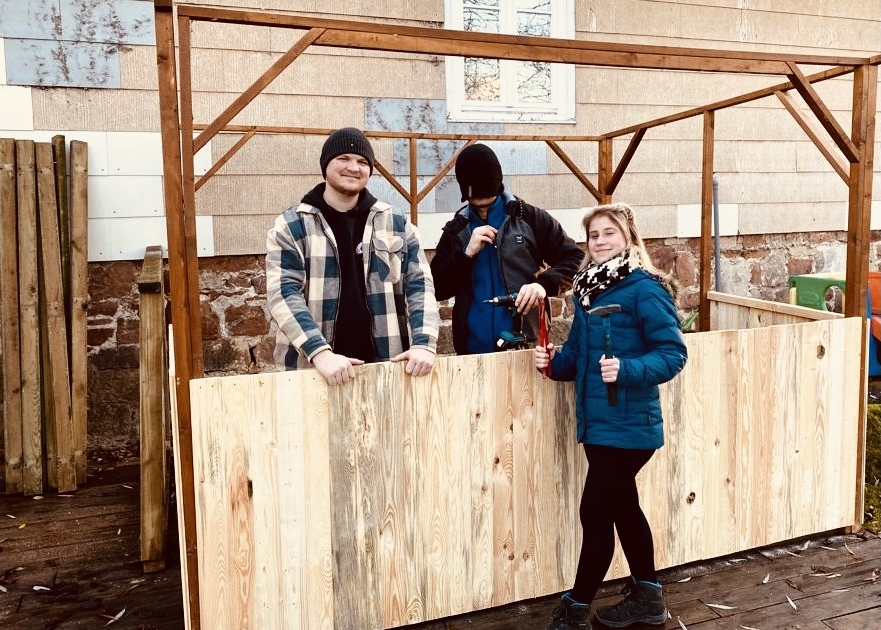 In aufwendiger Handarbeit zimmerten Schüler:innen und Pädagog:innen unter der Leitung von Nils Schwandt ganze fünf eigene Weihnachtsbuden. „Es war total toll zu sehen, wie begeistert und mit wie viel Einsatz die Schüler:innen an diesem Projekt mitgeholfen haben. Ohne die wäre es nicht gegangen“, berichtet Pädagoge Nils Schwandt glücklich.