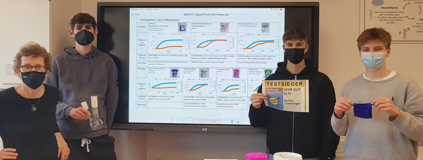 Ganz ohne Forschen geht es bei den drei Schülern aber dann doch nicht. Freitags im „Offenen Labor“ untersuchten sie die Wirksamkeit von Oxireinigern, die bei der Wäsche auch als Fleckensalze bzw. Bleichmittel eingesetzt werden. Auf den Verpackungen wird häufig mit einer Fleckentfernung bereits ab 20°C geworben. Vollmundigen Werbeaussagen wie, „Mit aktivem Sauerstoff für strahlendes Weiß“ oder „Wäsche-Booster ohne Chlor“, wollte das Team genauer auf den Grund gehen.