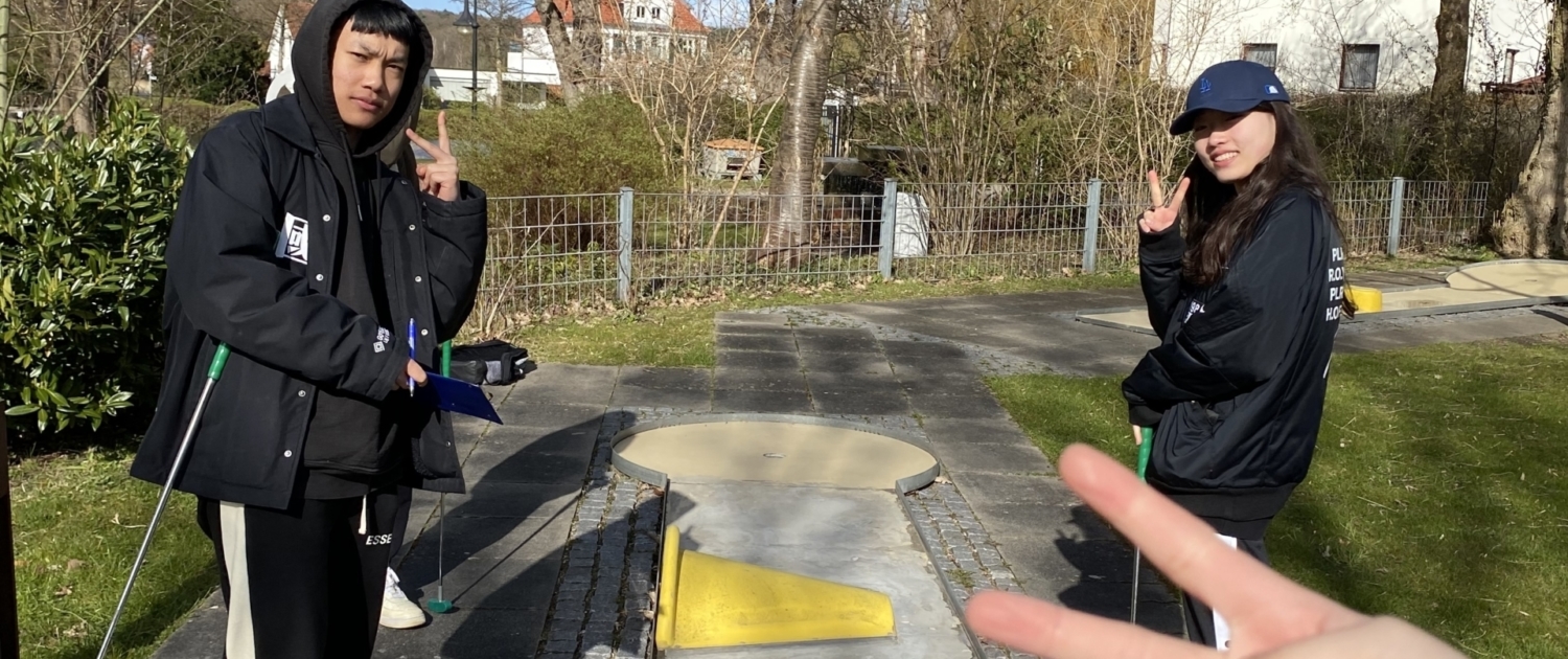 Deutsche Kultur erlebten die internationalen Schüler:innen beim Minigolfen. Noch nie einen Minigolfschläger in der Hand gehabt, dennoch mit viel Freude und Spaß dabei gewesen. „In Marburg gibt es ja auch einen Minigolf-Platz, vielleicht besuchen wir den jetzt öfter!“, lacht Bob nach der erfolgreichen Runde.