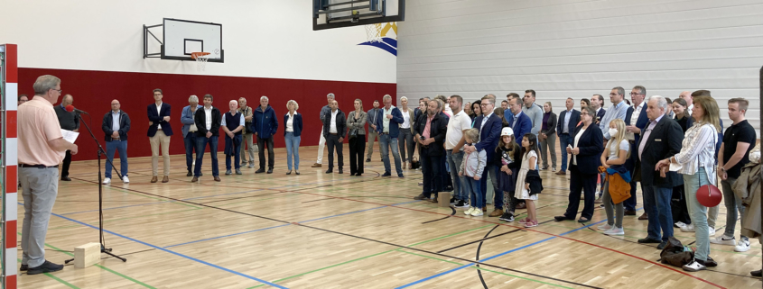 Gestern feierten am späten Nachmittag rund 100 geladene Gäste die Eröffnung der neuen Sporthalle. Der Vorstandsvorsitzende des Schulvereins Steinmühle Marburg e.V. Egon Vaupel begrüßte und bedankte sich bei allen am Bau Beteiligten sowie bei allen Unterstützer*innen, Bauleiter Jochen Schröder lieferte die wichtigsten Daten zum Bau, Claus Duncker, der Geschäftsführer der BLISTA, sprach über die gewachsene und erfolgreiche Partnerschaft Steinmühle/BLISTA und die Polit-Prominenz (Stadträtin Kirsten Dinnebier, Landtagsabgeordneter Dirk Bamberger und Kreisbeigeordneter Klaus Weber) beglückwünschte die Steinmühle zur neuen Halle.
