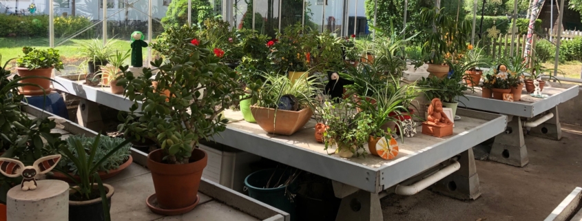 Dies nahmen Maria Ramos und Ines Vielhaben zum Anlass, die Symphonie aus Kunst und Natur im Gewächshaus und im Garten wieder zum Klingen zu bringen. Der WU „Garten und vegetarisch Kochen“ putzte also alle Pflanzen und die Räume fein heraus, um zwischen ihnen die Kleinplastiken und Handpuppen arrangieren zu können.