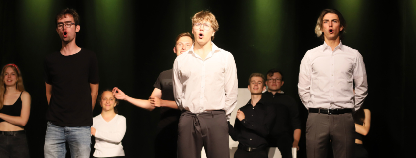 „Das Stück,“ so Melisande Lauginiger, „entführt uns in eine Gesundheitsdiktatur, in der Gehirnwäsche, Unterdrückung, Manipulation, Folter und Tod den Menschen nicht nur zu einer Marionette machen, sondern ihn seiner Individualität berauben.“ – Ein nachdenkenswerter Bühnenbeitrag, der mit viel Applaus bedacht wurde und den Sarah Mengel (12a), Joelina Merle (12a), Alina Klähn (12a), Yunxi Zhang und Fabian Diedrich (12c) unter Leitung von Kunstlehrerin Ines Vielhaben mit Plakaten illustriert hatten.
