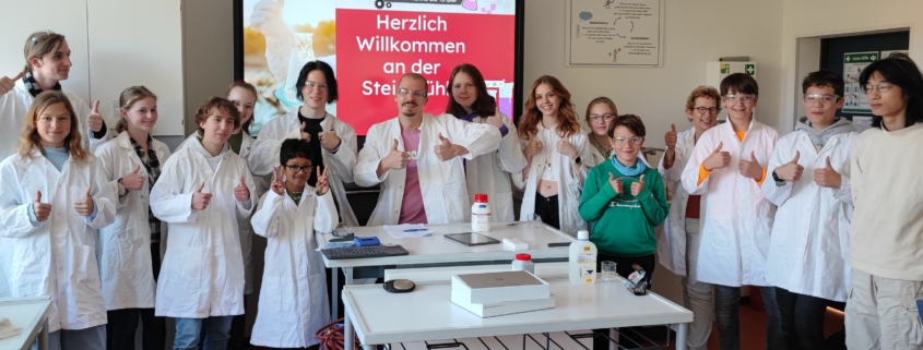 Im Chemielabor der Steinmühle angekommen, erhält Marcel von rund 25 Steinmühlen-Schüler*innen aus den Forschungskursen sowie dem MINT-Lehrer Dr. Patrick Szabo und MINT-Koordinatorin Dr. Jutta Töhl-Borsdorf einen würdigen Empfang. Bald schon werden Laborkittel und Schutzbrillen angezogen und Techtastisch legt los. Marcel ist mit Enthusiasmus, Witz und einer Portion Ironie bei der Sache, er hat ein gutes Gespür für die Schüler*innen. Er lebt seinen Traum und kann mit seiner Leidenschaft für MINT mittlerweile sogar seinen Lebensunterhalt bestreiten.