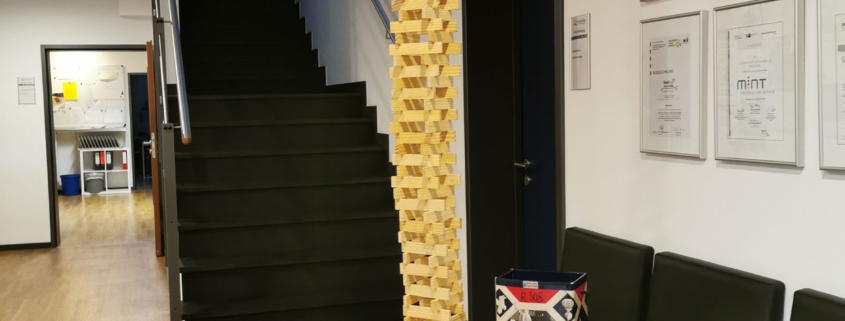 Eine längere Wartezeit kann man vielfältig nutzen: Man kann schimpfen und quengeln, man kann dösen – oder man kann etwas Kreatives schaffen. Für letzteres hat sich am Samstag ein Schüler entschieden, der mit seinen Eltern auf den Beginn seines Aufnahmegespräches bei der Schulleitung wartete. Er schnappte sich die vor Ort bereitliegenden Kapla-Steine, einige Bücher und konstruierte daraus dieses eindrucksvolle Bauwerk. Als der Turm eine zu große Höhe erreichte, kam sein mitwartender kleiner Bruder ins Spiel. Er bat diesen, mit Hilfe einer von ihm selbst gestellten „Räuberleiter“ doch bitte weiter hoch zu bauen. Gesagt – getan. Als die Wartezeit um war, war auch der Turm fertig, der zum Bestaunen vor dem Schulleiterzimmer stehenblieb.