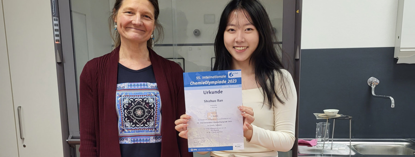 Shizhuo Ran aus dem Jahrgang 13 der Steinmühle hat erfolgreich an der 1. Runde des Auswahlverfahrens zur 55. Internationalen ChemieOlympiade (IChO) teilgenommen, die dieses Jahr in Zürich stattfindet. Eine entsprechende Nachricht überbrachte das IChO-Team vom Leibnitz-Institut für die Pädagogik der Naturwissenschaften und der Mathematik in Kiel. Die gesamte Steinmühle gratuliert zu diesem Erfolg, der der Teilnehmerin und ihrer betreuenden Lehrkraft Sirii Wienbeck (Foto) je eine Urkunde einbrachte. Die Chemie-Olympiade umfasst nahezu das gesamte Spektrum der Chemie, so beispielsweise Anorganik, Organik, physikalische Chemie, analytische Chemie, Biochemie und Spektroskopie. Viele der behandelten Themen haben Universitätsniveau.