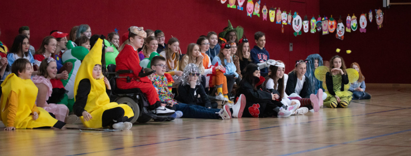 Am Donnerstag, 16. Februar, war es nach Jahren der unfreiwilligen Zurückhaltung einmal wieder soweit: Um 14 Uhr öffnete – erstmals – die neue Turnhalle ihre Türen für die Kinder der Klassen 5 und 6, von denen viele fantasievoll und vielfältig verkleideten waren. Sie erlebten mit einem bunten Programm aus gemeinsamem Tanz und Disco, Kostümpräsentationen, reichlich Bewegung in der Faschingsolympiade und dem abschließenden Pommes-Imbiss zusammen mit ihren Lehrerinnen und Lehrern einen ausgelassenen, fröhlichen Nachmittag. Schön, dass das wieder möglich war und ist!