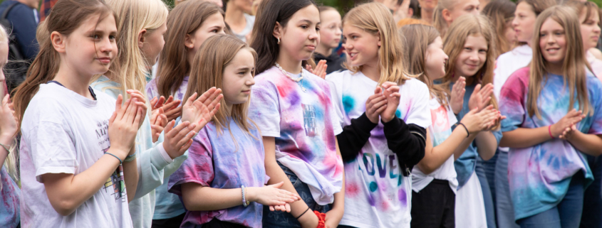 „Vielfalt ist nicht definierbar“, hieß es am 23. Mai bei der Pausen-Aktion, bei der alle Schüler:innen, die Lust hatten, am Forum in den Mottoshirts zum Song Cotton-Eye Joe tanzten. An der T-Shirt-Aktion beteiligten sich vorwiegend die Jahrgänge 5, 6 und 7 sowie die Klassen 11a, 12f. Den Eingangsbereich der Steinmühle bereichert seit dem Tag der Vielfalt eine Kunst-Allee, die durch verschiedene Skulpturen signalisiert, dass jede:r in seiner oder ihrer Vielfalt bei uns willkommen ist. Die Figuren fertigte der frühere Wahlunterricht 10 (jetzt im Jahrgang 11) und der Kunst-LK. Bei ihnen allen bedankte sich Schulleiter Bernd Holly noch einmal für Einsatz und Engagement.