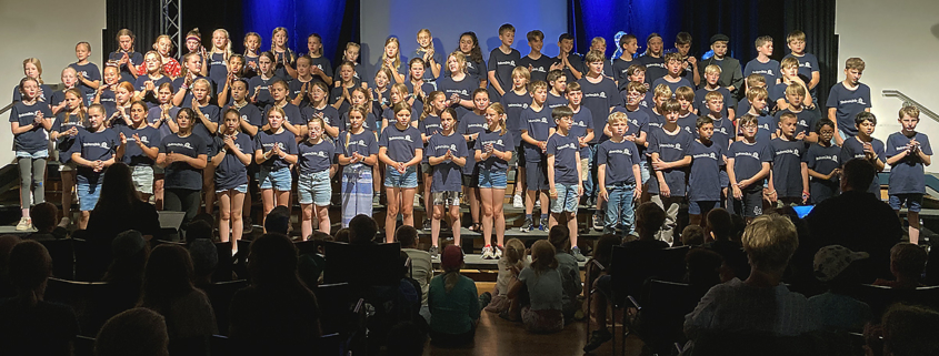 „Sowieso“, der ähnlich lautende Song von Mark Forster aus dem Jahr 2016, begleitete auch die Aufführung der 86 Schülerinnen und Schüler über den gesamten Abend wie ein roter Faden. Und da gute Laune bekanntlich ansteckend ist, gelang es den Mädchen und Jungen in ihren Steinmühen-T-Shirts, diese Welle auf den vollbesetzten Saal überschwappen zu lassen. Die Interpretation von Liedern, die weit vor ihrer Zeit populär waren, den Angehörigen im Zuschauerraum aber sehr geläufig, halfen dabei. Dargeboten wurden Let’s Twist Again, The Lion Sleeps Tonight und Klassiker wie Fly Me To The Moon oder Another Brick in the Wall. Aber auch neuere Hits waren Teil des Programms wie Sunroof und der Song Millionen Lichter von Christina Stürmer aus dem Jahr 2015, der sich wunderbar interpretieren ließ.