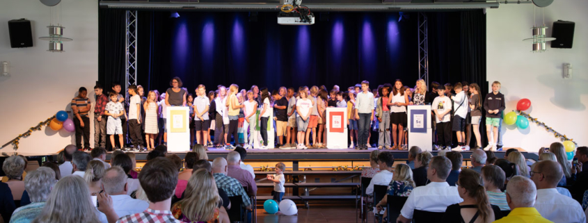 Dabei füllte sich das Forum auf dem Steinmühlengelände schnell. Die jungen Schüler:innen brachten familiäre Begleitung mit und belegten somit jede Sitz- und Stehmöglichkeit im Saal. Begrüßt wurden die neuen Gesichter von den Schüler:innen der Klasse 6 und der Musicalband mit deren Leiter Frank Wemme, der an der Steinmühle gleichzeitig Leiter der Sekundarstufe I ist. Ein buntes Liederprogramm aus Teilen des Musicals „Alles wird gut, sowieso“ des vergangenen Schuljahres lud die Neuankömmlinge direkt zum Mitsingen ein. Egal ob internationale Hits wie Mamma Mia (ABBA) oder deutschsprachige Klassiker wie „Millionen Lichter“ (Christina Stürmer) – die sechsten Klassen begeisterten zum Auftakt in die neue Schulzeit. Nach dem starken Applaus für das Bühnenprogramm begrüßte Schulleiter Björn Gemmer in einer kurzen Ansprache die Schüler:innen und Eltern.