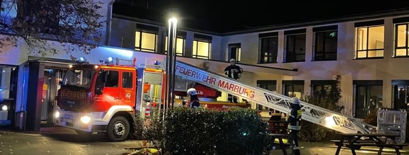 Ihre Jahresabschlussübung führte die Freiwillige Feuerwehr Marburg-Cappel in der Steinmühle durch. Der vorgestellte Ernstfall: Ein Brand im Chemie-Raum! Zu späterer Stunde, im Dunkel des neunten Novemberabends, rückte ein Löschzug mit Blaulicht an: Fünf Fahrzeuge inklusive Drehleiter passierten nach heruntergefahrenem Poller den Eingang des Schulgeländes und positionierten sich geschickt zwischen den Beeten auf dem Innenhof und auf dem benachbarten Freigelände.