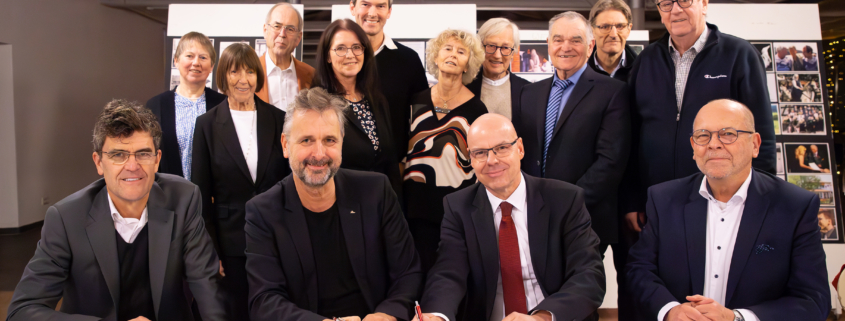Während die Feierlichkeiten zum Jubiläum im Juni 2024 anstehen, wurde auf den aktuellen Vertragsschluss bereits angestoßen: Nach zweistündigem notariellem Vortrag der Inhalte durch Notar Dr. Anton Schmölz setzten die Beteiligten ihre Unterschrift unter das Dokument. Gefeiert wurde mit der zweiten und dritten Generation der Gründerfamilie Buurman, dem Vorstand des Schulvereins, Egon Vaupel und Gerhard Müller, leitenden Mitarbeiterinnen und Mitarbeitern des Internats und dem Schulleitungsteam um Schulleiter Björn Gemmer: „In ihrer pädagogischen Zielrichtung waren sich Schule und Internat schon immer einig, was uns auf operativer Ebene, also wenn es um die Schülerinnen und Schüler ging, schon immer gut hat zusammenarbeiten lassen“, erinnert sich Gemmer und ergänzt: „Ich habe großen Respekt vor Familie Buurman, dass sie ihr Familienunternehmen verkauft hat, um der Steinmühle eine positive Zukunft zu sichern. Emotional war das sicher nicht einfach“.