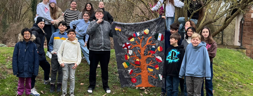 Um diese Vielfalt zu feiern, hat sich die Kunstlehrerin Ines Vielhaben im Rahmen des Projekts „Kleider machen Leute“ eine Gemeinschaftsaktion für die gesamte Klasse überlegt. Das geplante Wandbild soll die natürliche Vielfalt und Gemeinschaft der Weltbürger:innen innerhalb dieser Klasse symbolisieren. Jede Schülerin und jeder Schüler der Klasse hat ihr oder sein Blatt, ihre oder seine Frucht oder ihr/sein Insekt an diesem Baum selber genäht und gestaltet. Das Foto stammt von Gisela Glatzl, die das Nähprojekt tatkräftig seit vielen Jahren ehrenamtlich unterstützt.