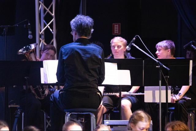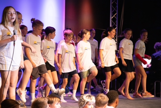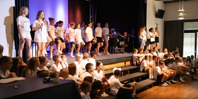 Das Schöne an den musikalischen Darbietungen war: Die präsentierten Lieder kannte jeder im Publikum. Der Song „Hurra hurra, die Schule brennt“ bezog sich auf den stattgefundenen Brand des Schulhauses in 1967, kam aber trotz dieses ernsthaften Hintergrundes auch ein wenig humorvoll herüber. Und wenn den fünften Klassen auf der Bühne der Text von „Dancing Queen“ wie selbstverständlich über die Lippen kommt und sie aus voller Kehle singen, dann merkt man erst, welche Legenden ABBA doch sind. Beiträge wie Yellow Submarine und Wind of Change knüpften ebenfalls an die Steinmühlen-Chronik an, ging es doch im einen Fall um Wasserkraftwerk und Hochwasser, im anderen um die Bus-Fluchthilfe in den Achtzigern. Weitere Geschichten aus der Steinmühlen-Historie, zu der auch die zahlreichen Bauphasen gehörten, wurden mit vielen großen Hits musikalisch auf die Bühne gebracht. Gleich zweimal ertönte Aquarius (Let the Sunshine in) – nämlich auch als Zugabe für diesen grandiosen Gesamtauftritt. Dazu gehörte auch die Musik der Musical Band mit jungen Musikern der Klassen 6 bis 13 sowie die Darbietung zweier ehemaliger Schüler am Saxophon und an der Posaune. Neben der Musik waren auch vier Tänze zu sehen, die im Sportunterricht der vier Klassen erarbeitet worden waren. Für Licht und Ton sorgte die AG „Sound & Light“ mit Schülern der Klassen 9.