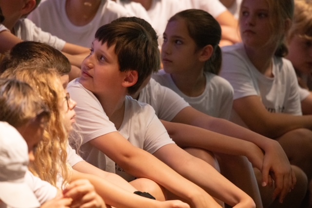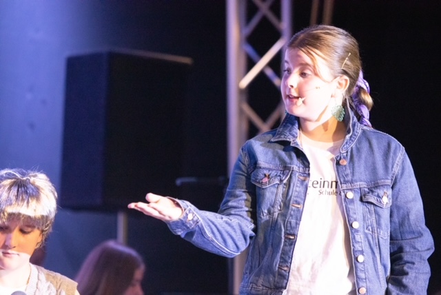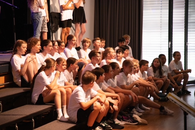 Stets sind es viele Köpfe und viele Hände, die überhaupt erst möglich machen, was später zu sehen und zu hören ist. Das war diesmal ganz besonders der Fall. Schon vor Wochen hatte sich Jasmine Weidenbach, erste Vorsitzende des Fördervereins Steinmühle, über die optische Wirkung der auftretenden jungen Sängerinnen und Sänger Gedanken gemacht. Mit ihren logobedruckten hellen T-Shirts präsentierten sie sich als große Gruppe auf der Bühne und jeder wusste sogleich: Hier spielt die Musik! Die Klasse 6i hatte die Plakate entworfen, Kira Gräser aus der Elternschaft für Maske, Kostüme und Bühnendeko gesorgt. In gewohnt zuverlässiger Weise hatte das Hausmeister-Team im Vorfeld Bestuhlung und alle logistischen Erfordernisse sichergestellt. Nun konnte nichts mehr schiefgehen.