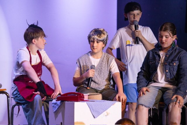 Neben Präsentation der Musik der vergangenen 75 Jahre erzählten die fünften Klassen gleichzeitig noch eine Geschichte. Nämlich die einer turbulenten Familie mit einer gestressten Mutter, die angesichts ihres bevorstehenden Vortrags zum Jubiläum auf die Hilfe ihrer Eltern, also Oma und Opa, sowie ihrer zwei Kinder angewiesen ist. Leider geht dennoch einiges schief…