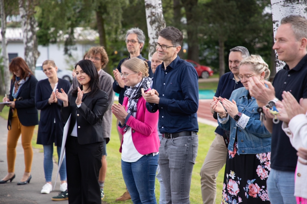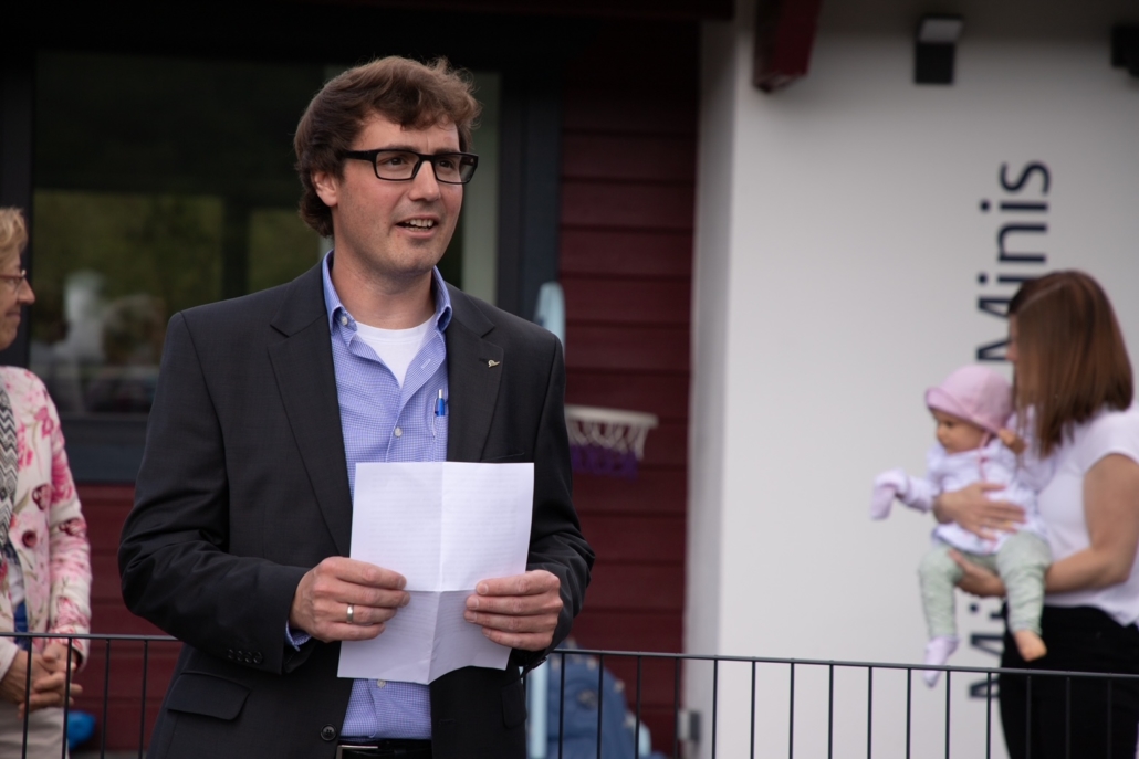 Zur offiziellen Einweihung des Gebäudes der MühlenMinis war auch eine Vertreterin des zweiten Kooperationspartners Sparkasse Marburg Biedenkopf erschienen: Steinmühlen-Geschäftsführer Dirk Konnertz begrüßte Personalleiterin Michaela Weiser. Vor Ort waren auch Bürgermeisterin Nadine Bernshausen und Petra Prenzel vom Fachdienst Kinderbetreuung der Stadt Marburg. Die Bürgermeisterin war sehr angetan von dem „wunderbaren Gelände“ und brachte Präsente mit. Die Eröffnungsveranstaltung begleiteten viele Mitarbeiterinnen und Mitarbeiter der Steinmühle, darunter Schulleiter Björn Gemmer, Internatsleiterin Anke Muszynski sowie die Schulleitungsmitglieder Tobias Karlein, Frank Wemme und Dirk Lange.