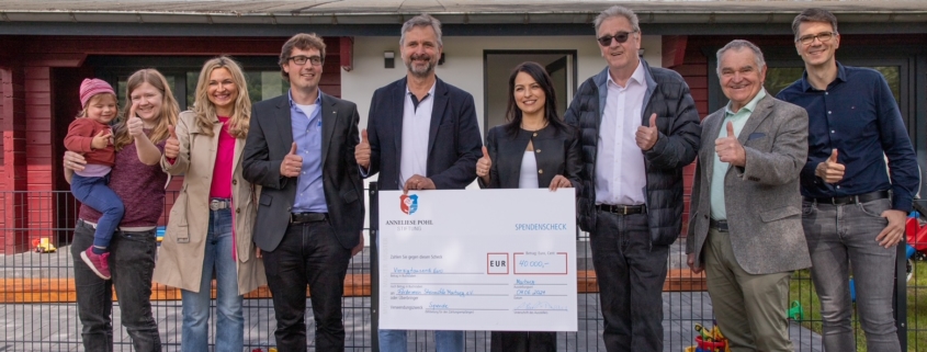 Die Anneliese Pohl Stiftung fördert das Tagespflegegruppen-Projekt „MühlenMinis“ an der Steinmühle mit 40.000 Euro. Aus diesem Grund gab es einen „Großen Bahnhof“ für die kleinen Lieblinge. Das neu sanierte Blockhaus auf dem Gelände der Steinmühle wurde jetzt für die beiden Tagespflegegruppen für Kinder im Alter von 1-3 Jahren offiziell seiner Bestimmung übergeben. Mit dabei waren Schulvereinsvorsitzender Egon Vaupel und sein Vertreter Gerhard Müller, kommunale Vertreterinnen und Vertreter sowie Arzu Kurt-Duran, Geschäftsführerin der Anneliese Pohl Stiftung. Sie überreichte der Steinmühle zur Unterstützung des Projekts einen Scheck in Höhe von 40.000 Euro.