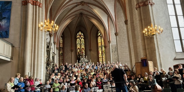 Die Lutherische Pfarrkirche war ausverkauft: Das 77köpfige „Klangforum Marburg“, eine Kooperation der Steinmühle und der Musikschule Marburg, hatte mit der Singakademie Frankfurt (Oder) Johannes Brahms‘ „Deutsches Reqiem“ einstudiert. Das Chorwerk erklang mit musikalischer Unterstützung des Siegener Kammerorchesters „Camerata Instrumentale“.