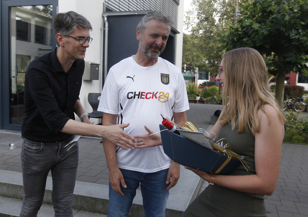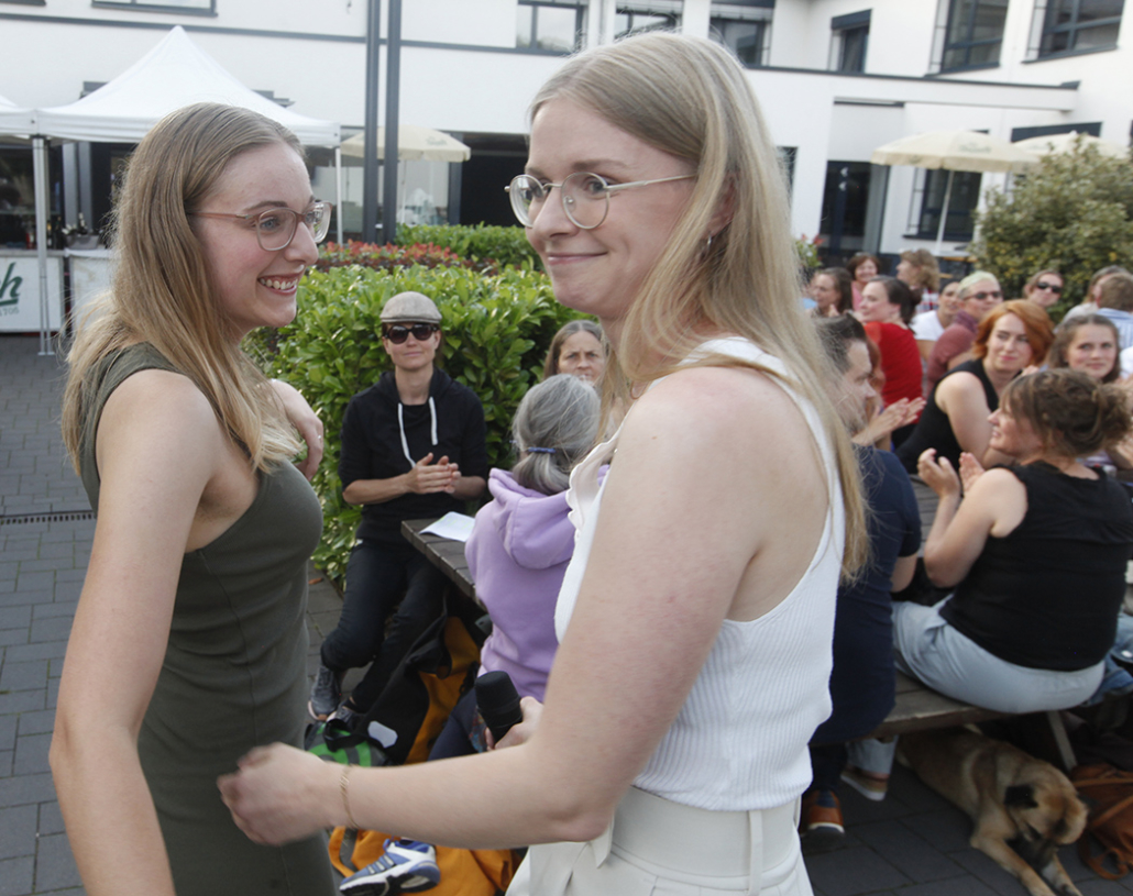 Besonders schmerzlich war der Weggang von Claudia Natterer, die seit 2008 an der Steinmühle Deutsch und Ethik unterrichtete und sich mit großem Engagement sowie ihrer besonderen Fähigkeit zu Kommunikation auf Augenhöhe verdient gemacht hat. Sie wird künftig in der Hochschullehre in Heidelberg tätig sein. Im Rahmen ihrer Rede würdigten Ines Vielhaben und Nicole Hohm das Engagement von Claudia Natterer, während Kristina Sokoli der geschätzten Kollegin von der Fachschaft Deutsch alles Gute für die Zukunft wünschte. Auch der Betriebsrat, vertreten durch Dr. Rainer Nietzke, verabschiedete sich mit herzlichen Worten und den besten Wünschen: „Hoffentlich hattet ihr eine gute Zeit“.