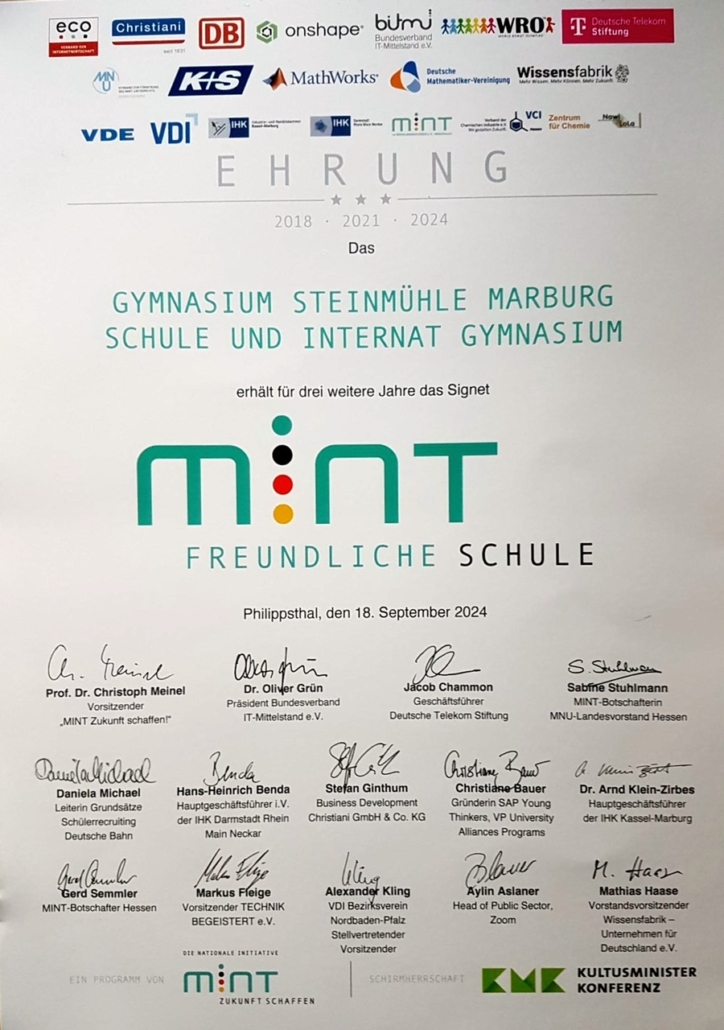Ein weiteres Mal wurde die Steinmühle am gestrigen Mittwoch als MINT-freundliche Schule ausgezeichnet. Dr. Jutta Töhl-Borsdorf und Dr. Sven Freibert nahmen die Ehrung im nordhessischen Philippstal entgegen und vertraten damit die Steinmühle als einzige beteiligte Schule aus Marburg.