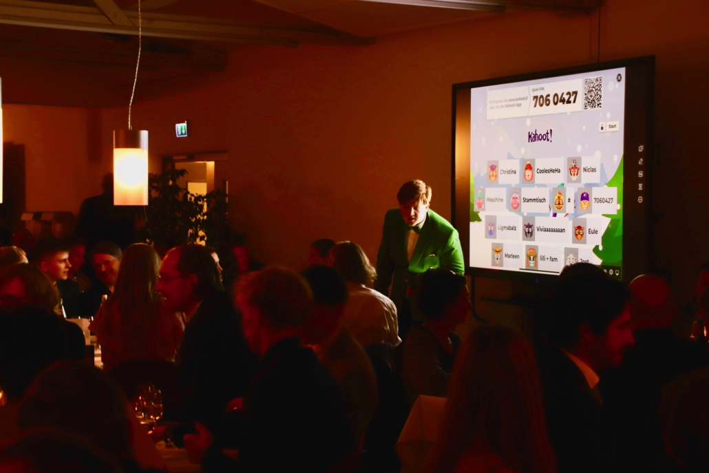 Um die Zeit zwischen den Gängen zu überbrücken, hatten die jungen Menschen zwei Kahoots organisiert, an denen man tischweise teilnahm. Ausgelassene Stimmung und angeregte Gespräche waren weitere Zeichen dafür, dass sich die teilweise weit angereisten Eltern wohlfühlten. Das vom Internatsrat organisierte Wichteln sorgte für so manch kleine Überraschung.